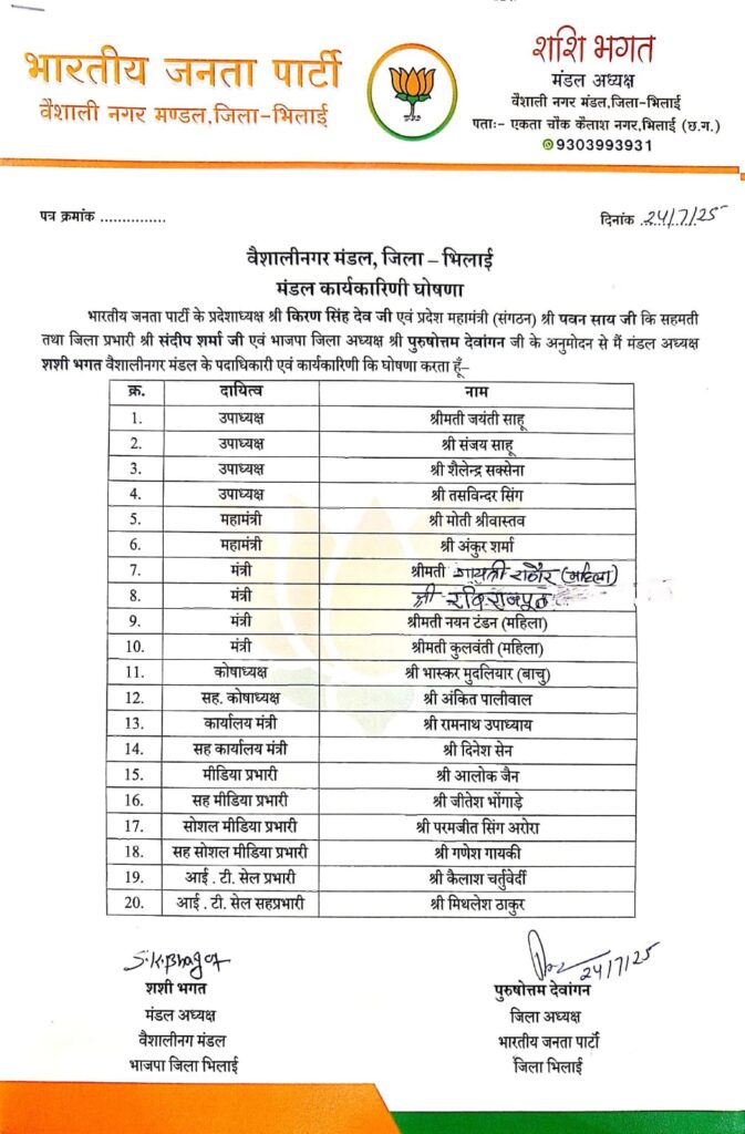 भिलाई। भारतीय जनता पार्टी जिला भिलाई के वैशाली नगर मंडल की नई कार्यकारिणी की घोषणा के साथ ही संगठन ने एक बार फिर यह साबित किया है कि समर्पित कार्यकर्ताओं को ही आगे बढ़ने के अवसर दिए जाते हैं। इस नई कार्यकारिणी में अंकुर शर्मा को मंडल महामंत्री की अहम जिम्मेदारी सौंपी गई है।