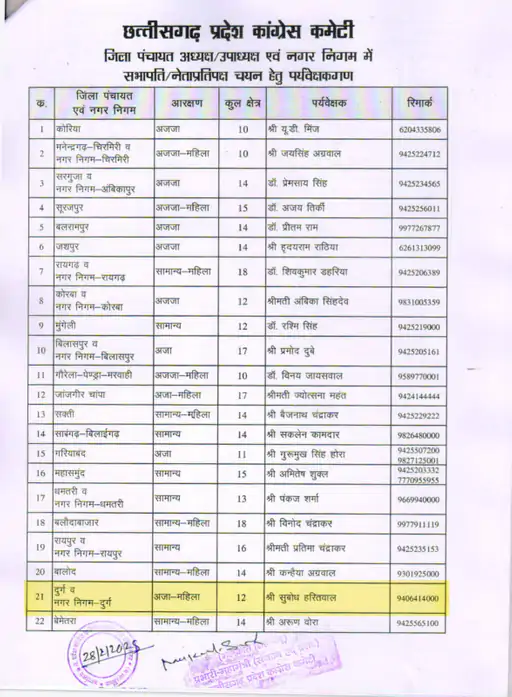 छत्तीसगढ़ प्रदेश कांग्रेस कमेटी ने जिला पंचायत अध्यक्ष, उपाध्यक्ष और नगर निगमों में सभापति और नेता प्रतिपक्ष के चयन के लिए पर्यवेक्षकों की नियुक्ति की है। रायपुर में प्रतिमा चंद्राकर, दुर्ग में सुबोध हरितवाल और बिलासपुर की जिम्मेदारी प्रमोद दुबे को दी गई है। इसी तरह पूर्व मंत्री जयसिंह अग्रवाल को मनेंद्रगढ़-चिरमिरी की जिम्मेदारी दी गई है। जबकि शिव डहरिया को रायगढ़ का जिम्मा मिला है। ज्योत्सना महंत को जांजगीर-चांपा जिले का पर्यवेक्षक बनाया गया है। ये फैसला आगामी चुनाव प्रक्रिया को सुचारू रूप से संचालित करने और सही नेतृत्व चयन को सुनिश्चित करने के लिए लिया गया है। नियुक्त पर्यवेक्षकों में अनुभवी नेताओं के साथ-साथ महिला प्रतिनिधियों को भी महत्वपूर्ण जिम्मेदारी दी गई है।