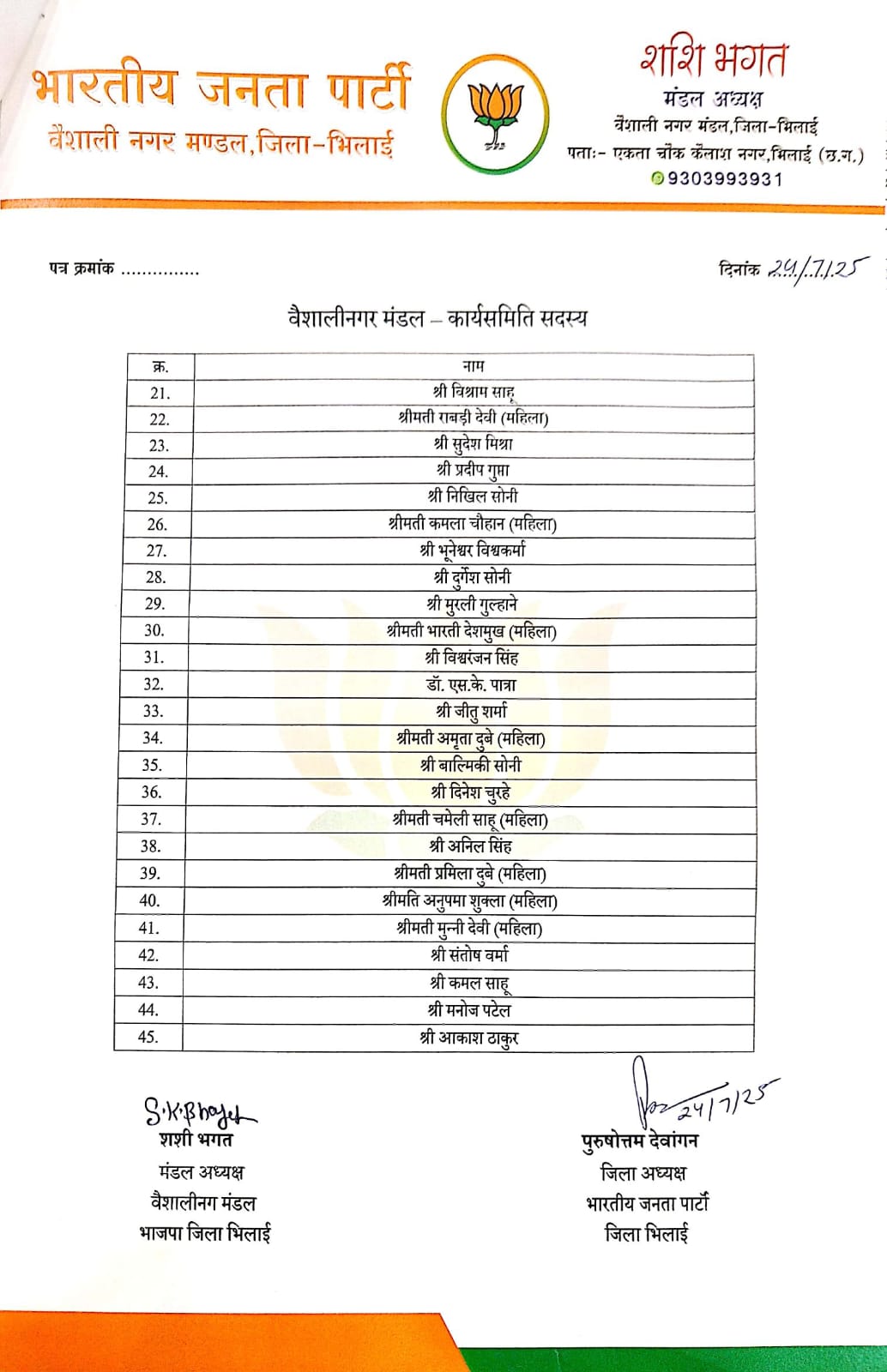 भिलाई । भारतीय जनता पार्टी जिला भिलाई के वैशाली नगर मंडल की नई कार्यकारिणी की घोषणा आज औपचारिक रूप से की गई। संगठन विस्तार और आगामी चुनावी तैयारियों के मद्देनज़र बनाई गई इस कार्यकारिणी में पार्टी ने युवाओं और जमीनी स्तर के सक्रिय कार्यकर्ताओं को महत्व देते हुए कई महत्वपूर्ण जिम्मेदारियाँ सौंपी हैं। इसी कड़ी में दुर्गेश सोनी को मंडल कार्यसमिति सदस्य नियुक्त किया गया है।